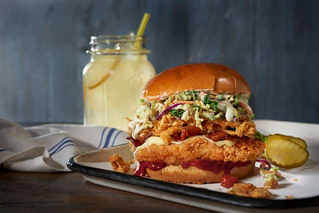 - For each sandwich, spread barbecue sauce on the bottom bun. Top with fried chicken, cheese, 2 bacon strips, fried onions and coleslaw. Top with crown of bun and serve.